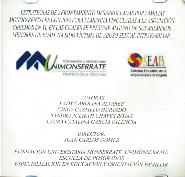 Estrategias de afrontamiento desarrolladas por familias monoparentales con jefatura femenina vinculadas a la asociación creemos en ti, en las cuales se presume alguno de sus miembros menores de edad, ha sido víctima de abuso sexual intrafamiliar. Lady Carolina Álvarez, Cindy Castillo Hurtado, Sandra Julieth Chaves Rojas ; director Juan Carlos Gómez
