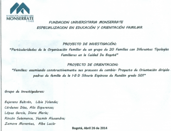 Trabajo de grado (Especialización en educación y Orientación Familiar).-- Fundación Universitaria Monserrate, 2014