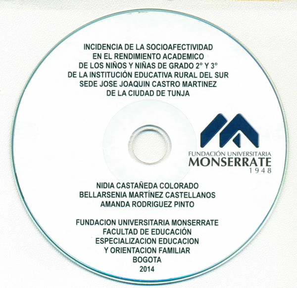 Incidencia de la socioafectividad en el rendimiento académico de los niños y niñas de grado 2 y 3 de la Institución educativa rural del sur sede José Joaquín Castro Martínez de la ciudad de Tunja Nidia Castañeda Colorado, Bellarsenia Martinez Castellanos, Amanda Rodriguez Pinto por Idioma: Español Bogotá Fundación Universitaria Monserrate 2014